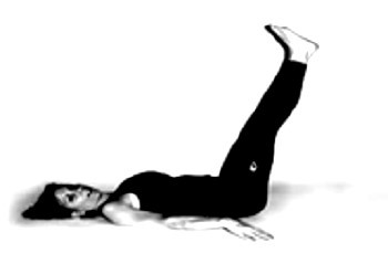 Hai tay đan sau gáy hoặc đặt dọc theo thân mình. Một chân duỗi thẳng và được nâng đỡ trên giường. Chân còn lại giơ cao 45 độ, khép, hơi xoay về phía đối diện, duỗi bàn chân xuống, đồng thời hít vào. Giữ mông bên chân giơ cao sát mặt giường. Giữ thẳng đầu gối rồi từ từ hạ chân xuống, đồng thời thở ra. Đổi chân và thực hiện như trên.