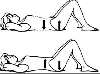 – Bài tập tăng tiến: Gồng cơ bụng, ấn lưng xuống sát mặt giường. Nhấc mông lên khỏi mặt giường, đồng thời hít vào. Từ từ hạ mông xuống, giữ lưng sát mặt giường và thở ra.