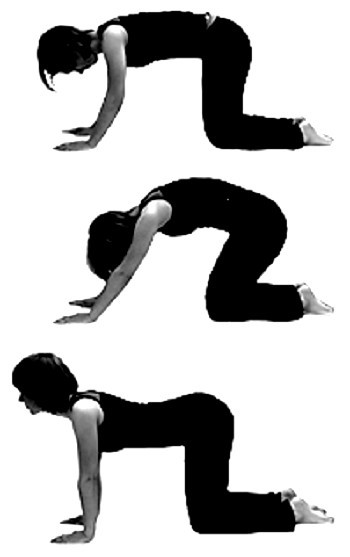 Hóp bụng lại, đồng thời hít vào. Uốn cong lưng lên phía trên và cúi đầu xuống. Ngẩng đầu lên và hạ lưng xuống, đồng thời thở ra. Lưu ý: Không di chuyển tay và chân khi thực hiện bài tập. Động tác này làm luân phiên, liên tục